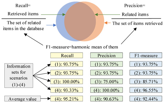The ratio of the number of these items to the number of items contained in the retrieved item sets was defined as precision, and the ratio of these items to the number of items contained in the relevant item sets in the database was defined as recall. The F1-measure was defined as the harmonic mean of precision and recall. The specific interpretation of these indicators and the test results based on the data in Table 5 were summarized in Figure 18. The test results indicate that the precision, recall, and the F1-measure of the NLP-based semantic framework for DFS were 95.21%, 90.63%, and 92.44%.