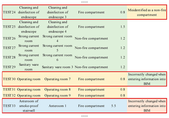 An error analysis was conducted to determine the reasons for compliance check deviations in the framework tests. Due to the limitations of semi-automatic data isomorphism technology, information errors may be caused by incorrect operations in the process of information transformation. Figure 19 provides an excerpt from the error analysis table, and errors in TEST24 were caused by the room of cleaning and disinfection of the endoscope being erroneously identified as a non-fire compartment, while TEST30 and TEST33 were caused by improper manipulation during data entry. Furthermore, recall was more significant than precision for automated compliance checking frameworks. This was because the noncompliance in the design work should be identified as much as possible, while precision deviation can be improved using analysis and elimination. The proposed framework has higher recall than precision, which indicates the efficiency and applicability of the framework for automated compliance checking.