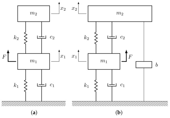 where , , and (or , , and ) are the mass, the linear viscous damping coefficient, and the stiffness of primary system (or TMD), respectively. b stands for the grounded inerter relating the tuned mass to the base. Moreover, and represent the displacement of the primary and tuned masses, respectively. Finally, the dots over symbols denote differentiation with respect to the dimensional time t. Clearly, by vanishing the inertance b, Equation (1) reduces to the equations of motion governing the dynamics of the coupled system schematized in Figure 1a.