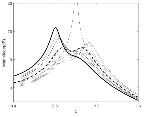 Figure 2 depicts various normalized frequency responses of a primary system controlled by a TMDI of which thew parameters are tuned by means of the classic equal-peak method. The responses are simulated for the set of parameters: . Clearly, two equal peaks can be observed in the frequency response curve in the nominal case (i.e., , as marked by a thick dashed line). Meanwhile, the peak vibration amplitude is inevitably amplified when the stiffness fluctuates, as represented by the 20 frequency responses marked by thin dotted lines, which correspond to 20 stiffness uncertainties , randomly sampled in the interval . In the worst-case scenario (marked by a thick solid line), the deterioration of the vibration control performance reaches up to dB, signifying that the peak vibration amplitude increases by for an uncertainty magnitude of when compared to the deterministic scenario. Therefore, the classic equal-peak method was unable to yield favourable results in the presence of uncertainty and a novel tuning rule should be developed with the aim of minimizing the worst-case peak vibration amplitude.