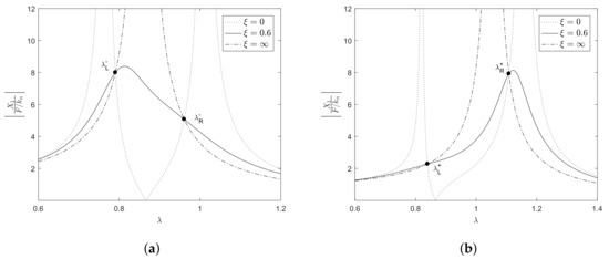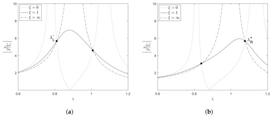 As stated by Dell’Elce et al. [36], the optimal tuning is achieved when the leftmost resonance peak with (i.e., ) has the same vibration amplitude as the rightmost one with (i.e., ). In conjunction with Figure 3, this optimality conditions can be mathematically formulated as: