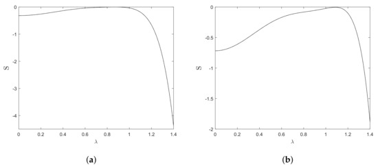 The evolution of polynomial function S is plotted for both in Figure 4. It is apparent that in each case of and , the polynomial S is a concave function which has only one maximum equal to zero. Therefore, the optimality condition (14) can be rewritten as: