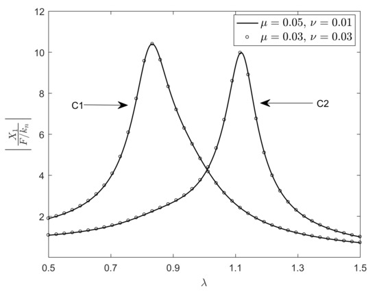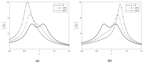 An observation can be made regarding Equation (35) that for a given bound on stiffness uncertainty , the vibration amplitude at fixed points is solely controlled by , i.e., the sum of the mass ratio and the inertance-to-mass ratio. In Figure 6 are plotted two identical frequency responses corresponding to different sets of parameters: , and (represented by solid lines) and , , and (represented by circle markers). Therefore, one can infer that in the harmonically forced case, the global vibration control effect remains unchanged if the total amount of tuned mass and inertance is unchanged. In other words, the tuned mass and the grounded inertance are interchangeable, so the need for the tuned mass can be partially diminished by increasing the amount of inertance.
