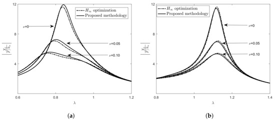 Based on the aforementioned optimality conditions, the proposed methodology is outlined below. In the worst-case optimal scenario, the optimal mechanical damping ratio can be expressed in terms of , , f and h by transforming Equation (9). On this basis, another expression for can be obtained by employing the perturbation approach, as mentioned in [42]. Equating these two expressions of yields a unique polynomial function which is independent of . As a consequence, optimal parameters can be determined by virtue of the algebraic properties of the polynomial function, e.g., the multiplicity of roots.