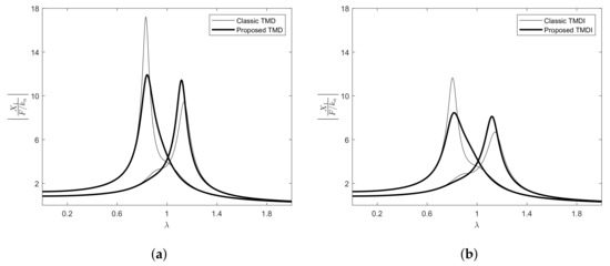 Frequency responses of an uncertain primary system controlled by means of (a) a TMD and (b) a TMDI. The set of parameters used for the simulation was , , and . Thin solid lines: using the classic equal-peak design; thick solid lines: using the proposed design (parameters given in Table 1 and Table 2).
