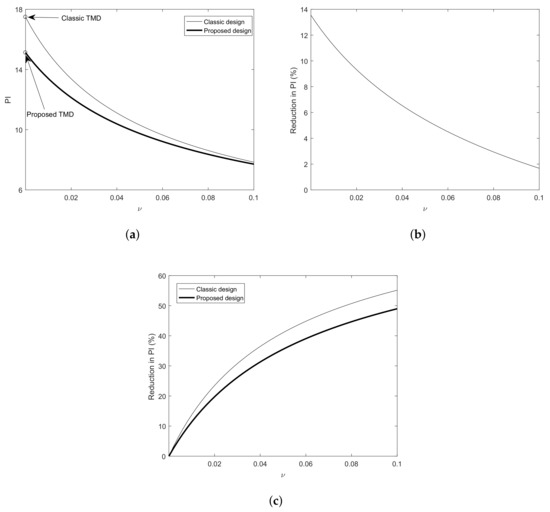 (a) Evolution of the performance index PI against the inertance-to-mass ratio for the set of parameters and . Thin solid line: TMDI with classic design; thick solid line: TMDI with proposed design; circle markers: TMD with either classic or proposed design. (b) Evolution of the reduction in PI for the proposed TMDI compared to the classic TMDI. (c) Evolution of the reduction in PI for the TMDI compared to the TMD. Thin line: classic design; thick line: proposed design.