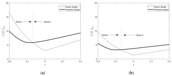Evolution of peak vibration amplitude against actual stiffness uncertainty changing within the interval , for an uncertain primary system controlled by means of (a) a TMD and (b) a TMDI. The set of parameters used for the simulation was , , and . Thin solid lines: using the classic equal-peak design; thick solid lines: using the proposed design.