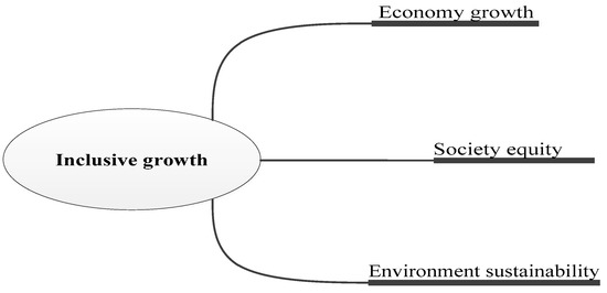 Although no clear definition of inclusive growth exists, researchers define it as “inclusive growth, which emphasizes ensuring that the economic opportunities created by growth are available to all—particularly the poor—to the maximum possible extent” [5]. According to the above literature analysis, this study defines the core concepts of the inclusive concept in three aspects, namely, social equity, economic development, and environmental sustainability (Figure 2).
