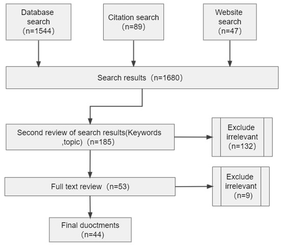 A systematic literature research process was used to identify influencing factors. It includes the following three steps (Figure 3). In the first stage, we conducted a comprehensive search through “title/abstract/keywords” to find the literature related to this topic, the key words including “inclusive”, “inclusive growth”, and “inclusive development”. Scoups, Web of Science, and CNKI were used as the main databases in this study. Through the first step, more than 1680 documents were identified. In the second stage, the primary literature was identified and screened. According to the search results, 185 literatures were identified by the title and abstract. In the third stage, the scope was finally narrowed down to key literatures especially related to infrastructure, sustainable construction, organizational equity, and social influencing factors through a full-text review method, and 44 publications were obtained for further analysis.