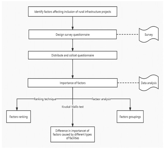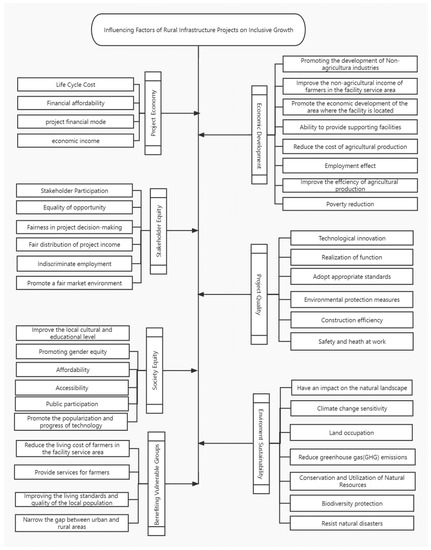 (3) The grouping formed by factor analysis is slightly adjusted. Finally, a model framework of rural infrastructure influencing factors on inclusive growth is formed. This model framework provides a basis for the further measurement of the monitoring and evaluation of rural infrastructure projects.