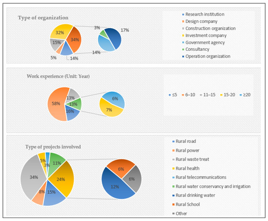 The research objects selected were experts involved in rural infrastructure, from government agency, investment company, operation organization, construction organization, design company, consultancy, and research institution. In order to select appropriate experts to participate in the investigation, this study selected the objective sampling method and the snowball sampling method for sampling. The purpose sampling method was selected because of the author’s work experience in the field of infrastructure, and some groups could be subjectively selected as research objects through relevant work experience. However, in order to increase the number of respondents as much as possible, snowball sampling was also adopted, by first interviewing a representative expert, and then being recommended by the visitor, and then interviewing a second person, and then being promoted by the second person to interview a third person, and so on, gradually increasing the number of respondents.