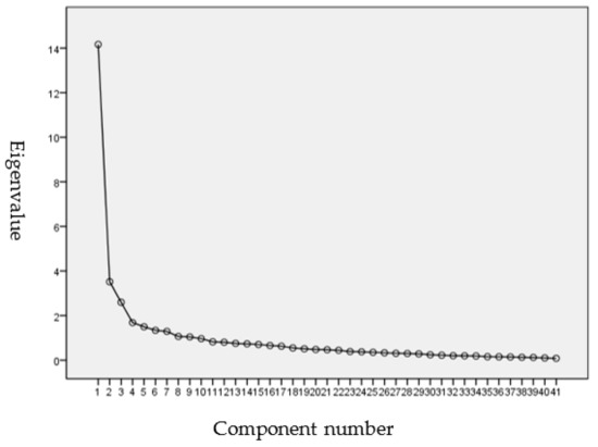 According to the setting that the eigenvalue was greater than one, a total of nine factor groupings were extracted through principal component analysis, and the explanation rate of nine factor groupings to all factors was 68.776%. The explanation rates of each factor are as follows: Factor groupings 1 (34.543%); Factor groupings 2 (8.580%); Factor groupings 3 (6.333%); Factor groupings 4 (4.109%); Factor groupings 5 (3.655%); Factor groupings 6 (3.267%); Factor groupings 7 (3.148%); Factor groupings 8 (2.593%); and factor groupings 9 (2.547%), as detailed in Figure 6.