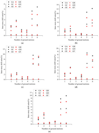 Figure 5 shows the inter-story drift ratios of the MCS models and refined FE models under three earthquake intensities. GA is the refined FE model with PGA = 0.056 g; GB is the MCM model with PGA = 0.056 g; GC is the refined model with PGA = 0.316 g; GD is the MCM model with PGA = 0.316 g; GE is the refined FE model with PGA = 0.45 g; and GF is the MCM model with PGA = 0.45 g. In all 90 sets of simulation results, there are 39 sets with error in [0, 15%), 29 sets in [15%, 30%), 18 sets in [30%, 50%), and 4 sets in [50%, 70%). When the inter-story ratio of the structure is small, the results of the MCM model analysis are closer to the results of the refined FE model analysis. The reason for the difference between the MCS models and refined FE models is that the seismic response of multistory RC frames using the MCS-model-based method is determined by its inter-story force–displacement relationship, which is greatly affected by the accuracy of the parameters of the three-linearity hysteretic model. These parameters are determined by statistical analysis, and have great uncertainty [30].