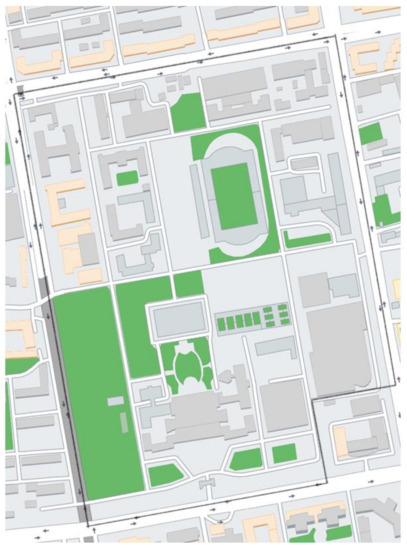The proposed method was applied to a university campus. The structures in the university campus were designed according to the seismic design code [39], and their seismic design PGA is 0.15 g, with a 10% probability of exceedance in 50 years. The shear-wave velocity of this site is in the range of (250, 500) m/s. Figure 9 shows the plan view of the campus. Table 10 shows the basic information of the buildings on the campus, including structural type, number of stories, and construction time. Buildings built before 1989 were calculated in the same way as buildings built after 1989, because of the revision of the Chinese seismic codes.
