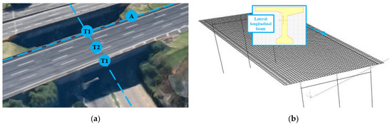 Brazilian bridge: (a) photo with the position of the sensors; (b) FEM model of the whole bridge and the lateral longitudinal beam [60].