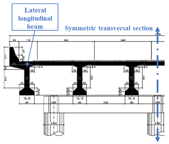 Transversal symmetric section (in cm) of the Brazilian bridge provided by the designer (VL = Longitudinal beam) [59,62].