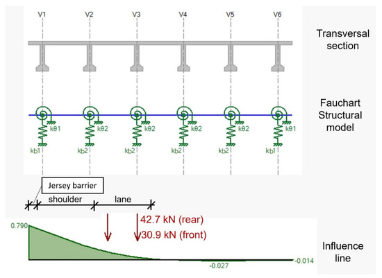 The transverse load distribution of the vehicle (one axis) was performed according to the Fauchart’s method, where the girders are replaced by translational (kb1 and kb2) and rotational (kθ1 and kθ2) spring constants, then connected to a longitudinal slab strip of 1.0 m width, as described in [16,64].