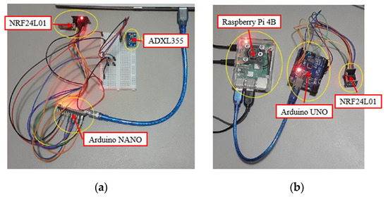 For the elaboration and transmission of data, the same accelerometer and “NRF24L01” device were used with the “Arduino NANO” device for the transmission, and the micro-computer “Raspberry Pi 4B” (see point A in Figure 1a) and microcontrollers “Arduino UNO” (Figure 4b) device for the elaboration/visualisation.