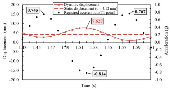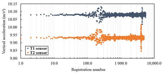 Figure 5 shows the non-adjusted registered vertical accelerations (~104 registrations) by the T1 and T2 sensors. The used maximum value is 7.98 m/s2 (see Section 4.1).