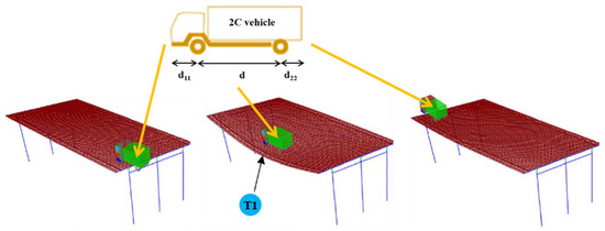 From the FEM model, the estimation of the vertical acceleration was also calculated. Due to the difficulty in simulating the real phenomenon well, 78 cases with several-speed v and mv of the vehicle were generated. These cases allow calibrating the model to obtain good results. Figure 6 shows the steps of the 2C moving vehicle on the bridge. In order to obtain consistent results concerning the real monitoring, the same T1 point was used as a reference point. The results are shown in Section 4.