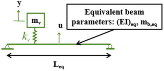 where mb,eq is the mass of the equivalent beam per unite length, (EI)eq is the equivalent elastic modulus times the moment of inertia, and u(x,t) is the vertical displacement of the beam. The superscripts (′) and (˙) denote differentiation concerning the horizontal axis x and time t, respectively.