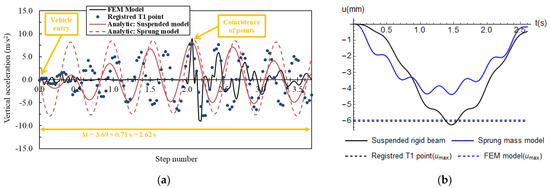Another aspect regarding the vibrations during the entering of the vehicle on the bridge. In fact, the bridge is fixed to the road by mechanical joints that can generate large vertical accelerations that must not be considered [11,35]. The free vibrations caused by all previous loads passing the considered beam were also suppressed (e.g., other vehicles, human-induced vibrations).