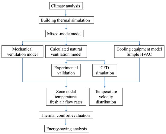 Figure 1 demonstrates the research method used to accomplish the paper’s goals. First, the study analysed the climate conditions of Beijing for the non-heating season using the Chinese Standard Weather Database (CSWD) to evaluate the overall feasibility of using free cooling outside (In the winter season of Beijing, space heating of the studied building utilises district central gas-fired boilers and radiators rather than a VAV system. Therefore, we only considered the non-heating season in this paper). Secondly, building thermal simulation was carried out in DesignBuilder 7.0 [] to predict the effect of mixed-mode cooling strategies on the thermal performance of the building. The multi-zone airflow network model was used for the natural ventilation calculation. A simple HVAC model was used for modelling the mechanical ventilation and cooling equipment performance regardless of the detailed HVAC system. The simulation obtained zone nodal temperatures and fresh air flow rates of the building operating under a typical natural ventilation mode (usually in April and October) and a mixed cooling mode (commonly in July and August). The predicted nodal air temperatures were validated with the experimental results of average zone air temperatures on an hourly basis for several successive days in April, May, and October from 2021 to 2022. Moreover, occupancy thermal comfort criteria based on PMV and adaptive models were predicted by the building thermal simulation. In addition to the thermal analysis, we used CFD simulation to show the distributions of air temperature and velocity and evaluate if natural ventilation can provide thermal comfort for indoor spaces. Finally, based on the building thermal simulation, the study estimated the energy saving of the mixed-mode building by comparing the energy use of the mixed-mode to that of the mechanical cooling mode.