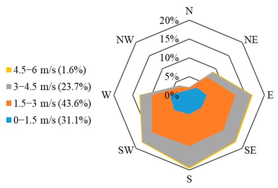 Climate wind speed and direction were analysed from April to October according to the criteria mentioned above, i.e., the favourable range of outdoor temperature is 19 °C–31.7 °C, and the humidity ratio is below 12 g/kg for potential natural ventilation. Figure 3 plots the wind rose indicating frequency distributions of the associated wind direction and speed. South is the predominant wind direction, followed by the southwest, southeast, and east directions. The longest spoke shows that the wind blew from the south at speeds between 0–1.5 m/s (blue) about 31% of the time, 1.5–3 m/s (bright orange) about 43.6% of the time, and 3–4.5 m/s about 23.7% of the time.