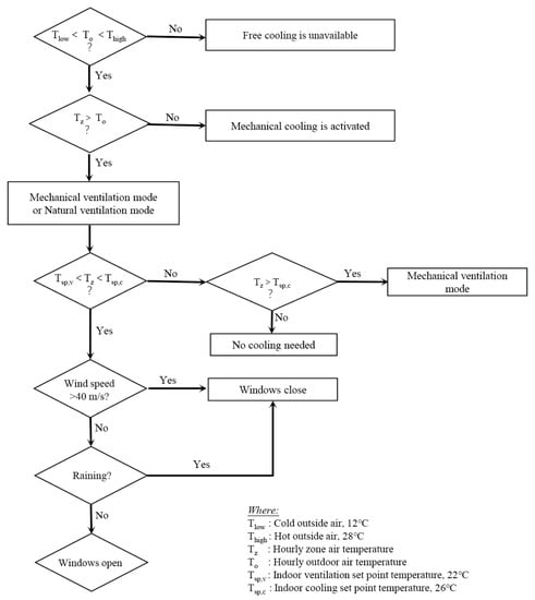 The change-over mixed-mode combines natural ventilation, mechanical ventilation, and mechanical cooling into one hybrid ventilation that determines the mode of operating depending on the outdoor temperature, indoor temperature, and setpoints for natural ventilation and cooling. Figure 5 presents the operating modes and the associated control strategies of the mixed-mode ventilated building. The natural ventilation mode is only available when the outdoor temperatures are within 12 to 28 °C. Meanwhile, the zone air temperature should be higher than the ventilation setpoint temperature, i.e., 22 °C, and lower than the cooling setpoint temperature, i.e., 26 °C. When the zone air temperature gets more elevated than the cooling setpoint during working hours from 8:00 to 19:00, the mechanical ventilation is activated. In this mode, mechanical fans deliver outdoor air to the indoor spaces. When the outdoor temperature reaches above 26 °C and gets higher than zone air temperature simultaneously, the mechanical cooling turns on to provide active cooling for building spaces.