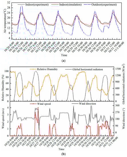 (a) Indoor air temperature profile compared between simulation and experimental results and the associated (b) outdoor weather data during a week in October 2021.