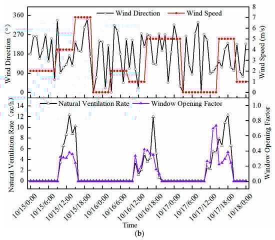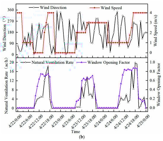 Room No. 403 was chosen to carry out the hourly simulation from April to October. Figure 11 shows the predicted temperature, ventilation rate, cooling load, and associated wind conditions for three days in April. During the spring season in Beijing, outdoor air temperature was cool enough to provide free cooling for the room (Free cooling was available when the indoor air temperature was higher than 22 °C but lower than 26 °C. Meanwhile, the operation schedule of mechanical ventilation coincided with the occupancy schedule for that period). Figure 11a shows that mechanical ventilation has sufficient capacity to meet the cooling load from 8:00 a.m. to 9:00 a.m. at the rate of 1.5 ac/h. After 9:00 a.m., the mechanical ventilation mode changed to natural ventilation induced by wind and stack pressures due to the temperature control strategies and ventilation schedule time. Cool air blowing from the operable window delivered sufficient cooling to maintain the indoor temperature at the cooling setpoint temperature (26 °C). The window opening factor is shown in the Figure 11b.
