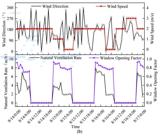 It is noticed that air temperatures obtained by the experiment and simulation present a similar trend for the studied periods when outdoor air conditions varied periodically. In Figure 9 and Figure 10, the discrepancies between them were found to be within 9.7% and 11.24%, with an average of 3.43% and 4.0%, respectively, which are lower than the maximum difference of 25% suggested in the ASHARE handbook of fundamentals []. The results showed that the credibility of the natural ventilation model is good enough to predict the effects of natural ventilation on the building’s indoor thermal environment.