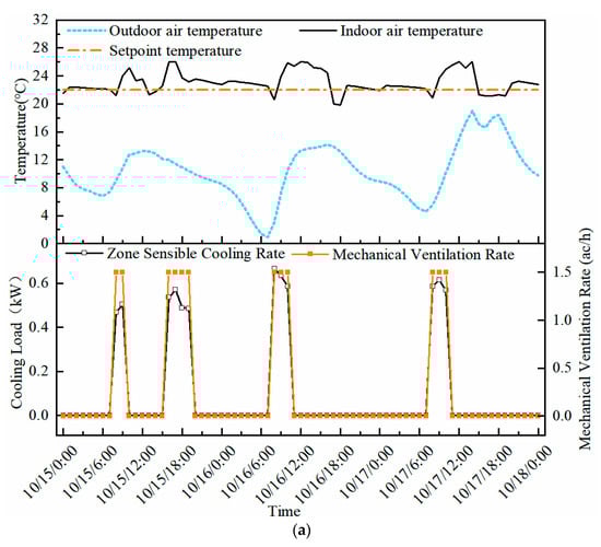 Figure 13 plots the simulation results for three days in October. The natural ventilation reduced the indoor temperatures below 26 °C.