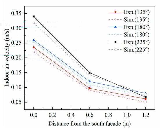 Figure 16 shows the validation of indoor air velocity distributions between the CFD simulated and experimental results. For the different wind directions (southeast, south, and w–southwest), indoor air velocity showed similar falling trends along the distance from the south façade. The simulated and experimental results were in good agreement, with a maximum discrepancy of 18.03% and an average error of 9.05%, showing that the CFD simulation model can provide accurate prediction results for indoor air velocity distribution.