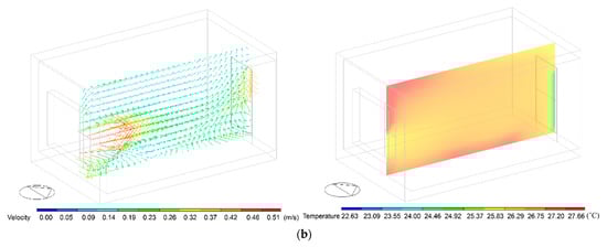 Figure 18 displays the temperature and velocity distributions at the 1.2 m height for the top floor of the naturally ventilated building for the conditions of closing and opening internal doors. The boundary conditions of walls, windows temperatures, and airflow rates through the openings were output directly from the thermal simulation at 16:00 on 27 October.