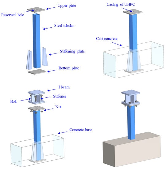 Fabrication procedures of test specimens are illustrated in Figure 2. The fabrication includes (1) Step I: Install the upper plate with reserved holes and bottom plate of the square steel tubular, and then, weld four stiffening plates. (2) Step II: Cast the foundation concrete of C40 with length, width and height equal to 1300, 450, and 500 mm, respectively, and then, cast the UHPFSRC to the square steel tubular through a reserved hole with 75 mm in diameter on the upper plate. (3) Step III: Bolt the stiffened I-beam to the upper plate.