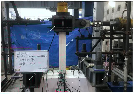 Setup of cyclic loading tests: (1) vertical actuator; (2) loading I-beam; (3) pressure beam; (4) specimen; (5) RC foundation; (6) LVDT; (7) horizontal actuator; (8) pressure beam.