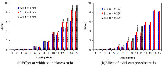 Figure 10 plots the dissipated energy at each single cycle for each specimen, and the effects of the width-to-thickness ratio and axial compression ratio were compared. No energy dissipation occurred before the first five loading circles until the drift ratio reached 2%, and after yielding occurred at the bottom of the columns, all specimens showed good energy dissipation, which means that they had entered the plastic working stage. Every specimen could dissipate more energy with the increase in loading cycle, especially at cycle 14 and 15. However, they needed to be unloaded because of the excessive lateral displacement. As shown in Figure 10a,b respectively, reducing the width-to-thickness ratio (increase in steel tubular thickness) or increasing the axial compression ratio, was found lead to greater single-cycle energy dissipation capacity of specimens.