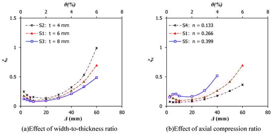 The capacity of energy dissipation is one of the most important indexes to evaluate the seismic performance of structures or structural components, and the equivalent viscous damping coefficient is most commonly used to represent energy dissipation capacity. Figure 9 shows the effect of the width-to-thickness ratio and axial compression ratio on the cumulative dissipated energy.