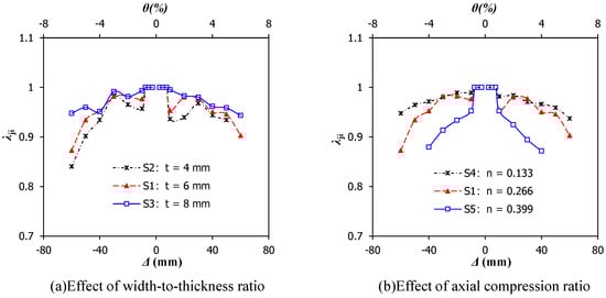 The strength degradation coefficients of specimens S2, S1 and S3 decrease in turn, indicating that the smaller the width-to-thickness ratio (the bigger the thickness of the steel tubular), the smaller the λji, as shown in Figure 12a, and the more stable the mechanical performance. With the decrease in the axial compression ratio of specimens S5, S1 and S4, the same strength degradation performance was also shown: the strength degradation coefficient decreased in turn, and the strength degradation was smaller. It can be seen from Figure 12b that the axial compression ratio of specimen S5 was the largest; thus, strength degradation was the most obvious.