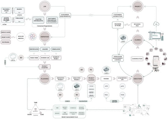 The state-of-the-art study provided support for the development of the methodology, outlined below. In fact, as part of a journey to digitize and simplify the construction process, a framework for the integrated management of a job order was developed: MSM (