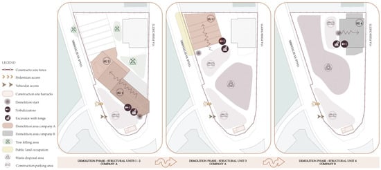 Before the beginning of the demolition activity, the verification and control of the detachment of gas, electricity and water supplies has been carried out. A further preventive check was carried out to monitor the conditions of conservation and stability of the structures to be demolished and of the single parts of the building, pursuant to art. 150 paragraph 1 of Legislative Decree 81/2008. A site logistics plan was prepared, and areas were identified for the positioning and parking of machines. The site was closed to non-experts by means of special signs and constantly protected by gates and fencing. In the demolition layouts (