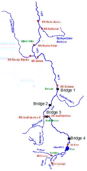 At the end of 2010, in November and December in Montenegro, in the territory of the Lim River valley, extensive rainfall occurred that caused severe flooding: the entire regions were flooded, especially those along rivers and lakes. In the first wave, as a result of four rainy days, the floods began on November 9 and lasted for 5 days. After a short-term stabilization of weather conditions, new rainfall from 17 November to 5 December followed, which caused a new wave of floods. The floods and extreme river streamflow caused great damage to infrastructure facilities, road facilities, embankments, etc. Traffic on some roads was interrupted due to floods. The greatest damages were caused by the river Lim with a sudden rise in water levels (water level maximums were recorded) at the municipalities of Plav, Andrijevica, and Berane. The Lim River, with its tributaries and an extremely large catchment area, has extreme fluctuations in water levels. Thus, the Lim River in Plav has a minimum flow Qmin = 1.5 m3/s, and a maximum flow Qmax = 324 m3/s, where the ratio is 216, and in Berane Qmin = 4.2 m3/s, and Qmax = 655 m3/s, where the ratio is 156. Such variations in the flow given by the ratio between the minimum and maximum flow, classify the Lim River as a torrential water flow that can have a significant negative impact on the environment. The consequences of such a devastating effect of the Lim River, among others, are that in the area between Berane and Plav, about 20 bridges were destroyed and/or damaged, with estimated damage in the amount of several million euros [].