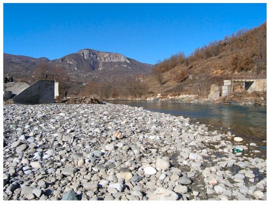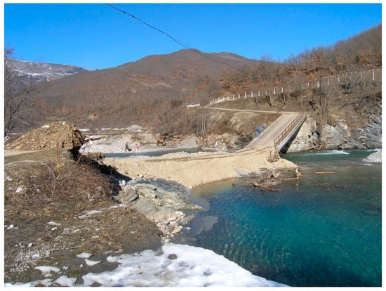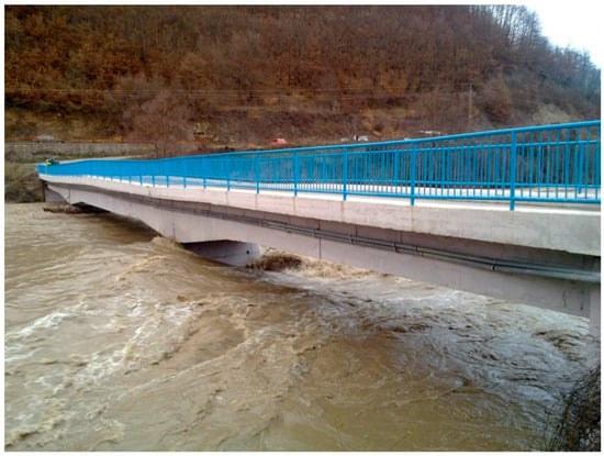 Furthermore, frequent damage to bridges in Montenegro occurred due to the scour that is caused by extreme river streamflow. In the scour process, the settlement of the bridge foundation occurred most often since bridges were inadequately founded, i.e., they were not founded on solid rock (if it was at an acceptable depth) or on piles, but shallow foundations were placed in the riverbed on the gravel material. The mountain torrential water flows with high water level oscillations present a particular danger for bridges in Montenegro. These torrential water flows can carry branches and trees that make a floodgate with great destructive action of water in the bridge zone [,,].