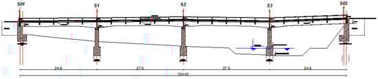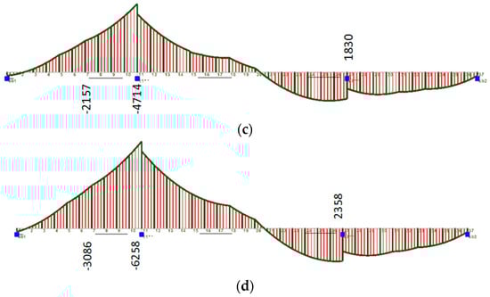 The bridge deck bending moment diagram for several settlement values under the pier S2, including permanent gravity loads, is presented in Figure 18b–d. The initial state shown in Figure 18a refers to permanent gravity loads acting on the deck structure.