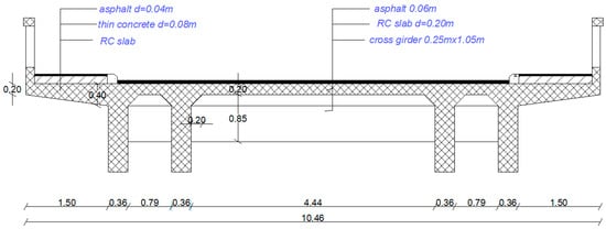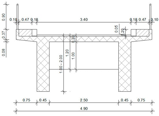 The Niko Strugar bridge is located in the city of Berane. It was built in 1965. The bridge is an RC bridge with a continuous deck system with four spans: 24.60 m, 27.60 m, 27.60 m, and 24.60 m. The total length of the bridge is 104.40 m. The width of the bridge is 10.46 m with two traffic lanes 3.57 m wide and two footpaths 1.66 m wide. The longitudinal bridge section in the axis of the bridge and deck cross-section in the middle of the spans are shown in Figure 3 and Figure 4. The bridge deck consists of two pairs of adjacent girders 0.36 m wide, placed at a distance of 1.14 m. The girders are variable in height: 1.60 m in the middle of the span, and 2.20 m at the supports, including the RC slab thickness. A girder’s height is changed linearly from the supports at the inner bridge piers over the length of 5.90 m on both sides, while at the rest of the span, the length height is constant. At the length of the variable girder height, the pairs of adjacent girders are connected by a flange 0.15 m thick at the bottom edge. The bridge has transverse girders at the supports and in the spans. Over the abutments, the cross-section dimensions of transverse girders are 0.50 × 1.60 m, over the inner supports 0.25 × 2.20 m, and in the spans 0.25 × 1.05 m. The transverse girder’s distance is 4.60 m along the spans, except for the first ones, which are placed at a distance of 6.20 m from the abutments. The RC slab is 0.20 m thick with a linear increase in thickness to 0.40 m at connections to the longitudinal and transverse girders along the length of 0.20 m. Footpaths are carried by cantilevers 1.50 m long. The thickness of the cantilever is 0.40 m at the fixed end, and 0.20 m at the free end. There is a 0.06 m thick layer of asphalt over the RC slab. The river piers are massive concrete elements with a depth of 1.20 m, 9.45 m width, and 5.95 m height, semi circularly rounded in the direction of the river flow. The foundations of river piers are shallow foundations with dimensions of 2.16 × 10.44 m in-plane, while the height of the foundation could not be determined on-site since the original project documentation was missing. The abutments are also massive concrete elements with dimensions that could not be determined on-site except for the width. The wing walls of the bridge are parallel. Over the left abutment is a fixed bearing, while over the other supports moveable bearings of the concrete pendulum system were designed.