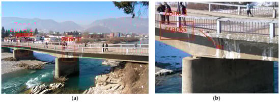 (a) The bridge after the settlement of the river pier and (b) cracks in zone 1.