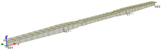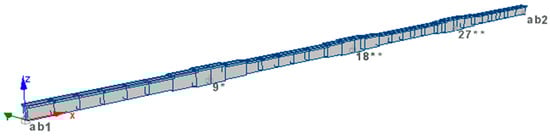 In order to design the appropriate structural strengthening of the damaged bridge 1 as well as to obtain a real distribution of action effects in the bridge 1 for the new damage state, a nonlinear analysis of the bridge 1 due to the settlement of the river pier was performed. A schematic representation of the model is shown in Figure 6.