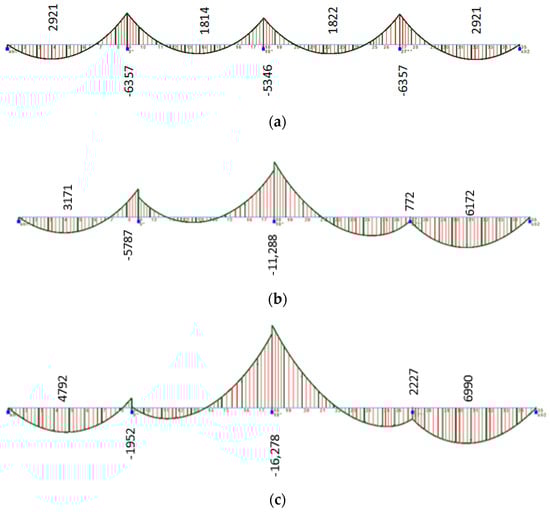 (a) Bending moment diagram—initial state (units in kN·m). (b) Bending moment diagram—settlement of 0.14 m under S3 (units in kN·m). (c) Bending moment diagram—settlement of 0.71 m under S3 (units in kN·m). (*, ** nodes at the bents).
