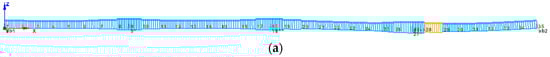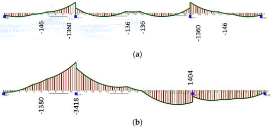 Since the nonlinear analysis confirmed plastic hinges formation in the bridge sections in zone 1 and zone 2, a new structural system of the bridge with hinges was formed for the design of structural strengthening of the bridge. The 3D model of the new structural system of the bridge with hinges was formed in the software package []. The hinges were modeled at the sections of plastic hinge formations in the main longitudinal girders and in the slab (zone 1 and zone 2). The longitudinal and transverse girders were modeled as linear elements, while the slab was modeled as a shell element. In addition, the river piers and abutments are modeled by shell elements. All structural elements are modeled with actual geometric characteristics, determined for a homogeneous cross-section without cracks. Action effects from gravity and traffic load were analyzed. The traffic load was calculated for the V-600 type vehicle and the 3.0 m wide traffic lane, according to the existing technical standards for bridge loads []. The adopted uniformly distributed load from the V-600 vehicle is 33.3 kN/m2. The distributed load in the main traffic lane is 5.0 kN/m2, and the uniformly distributed load outside of the main lane is 3.0 kN/m2.
